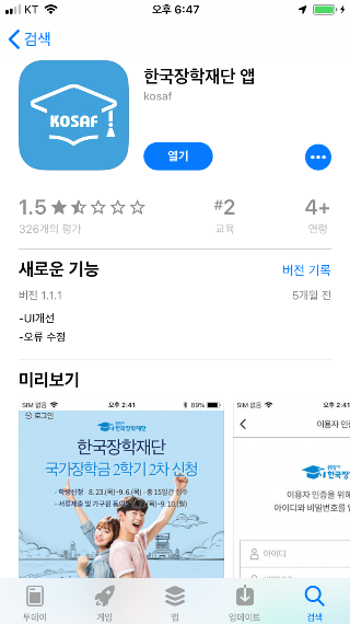 이렇게 한국장학재단 앱이 있습니다. 이걸로 하면 홈페이지에서 지원할 수 있는 몇몇 장학금에는 지원이 불가능하지만, 앱 속에 원클릭 신청이라는 기능으로 장학금을 신청할 수 있습니다.