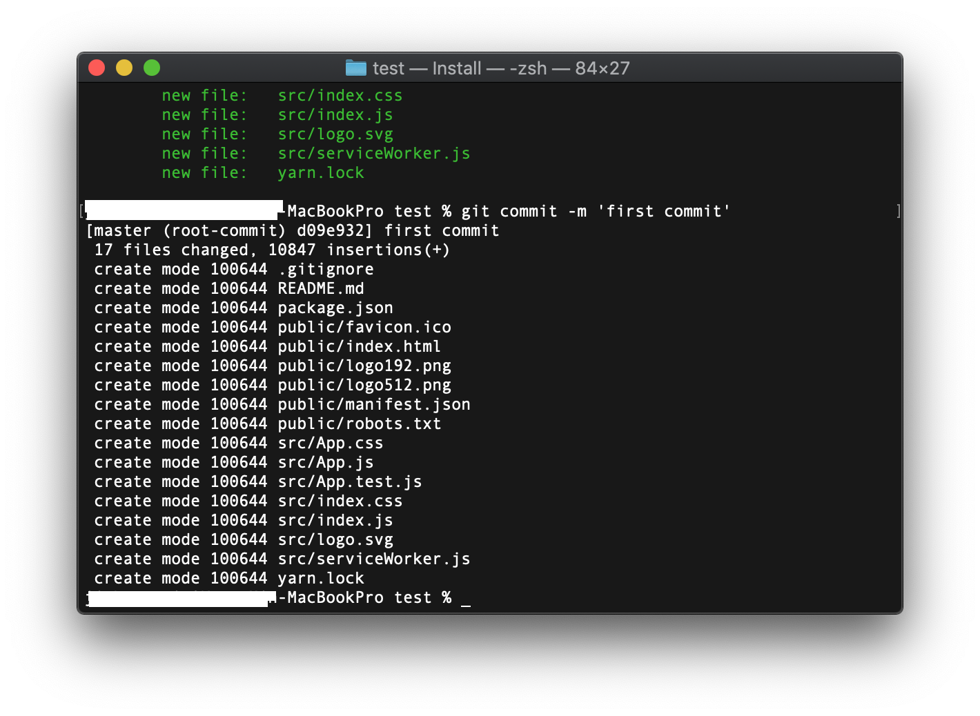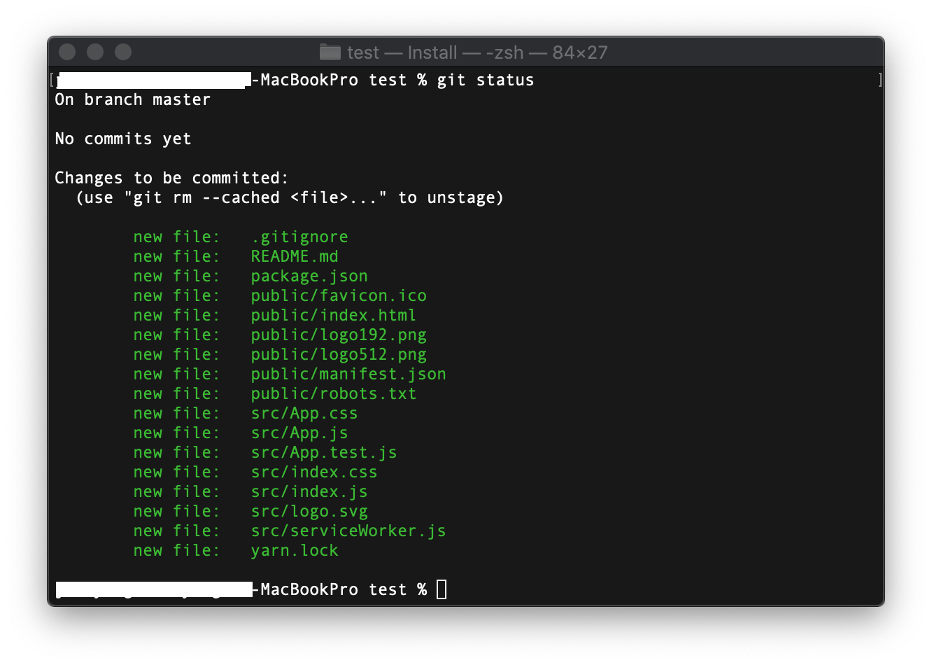 이제 status 가 초록색으로 바뀐 것을 확인할 수 있습니다. 초록색으로 바뀐 것은 파일들이 Staged 되었다는 뜻이에요. 이 상태가 되면 이제 커밋할 준비가 완료되었습니다. 저 No commits yet 아래에 Changes to be committed 문구가 그 사실을 알려주고 있죠. 이제 많이 들어보던 커밋을 할 차례입니다.