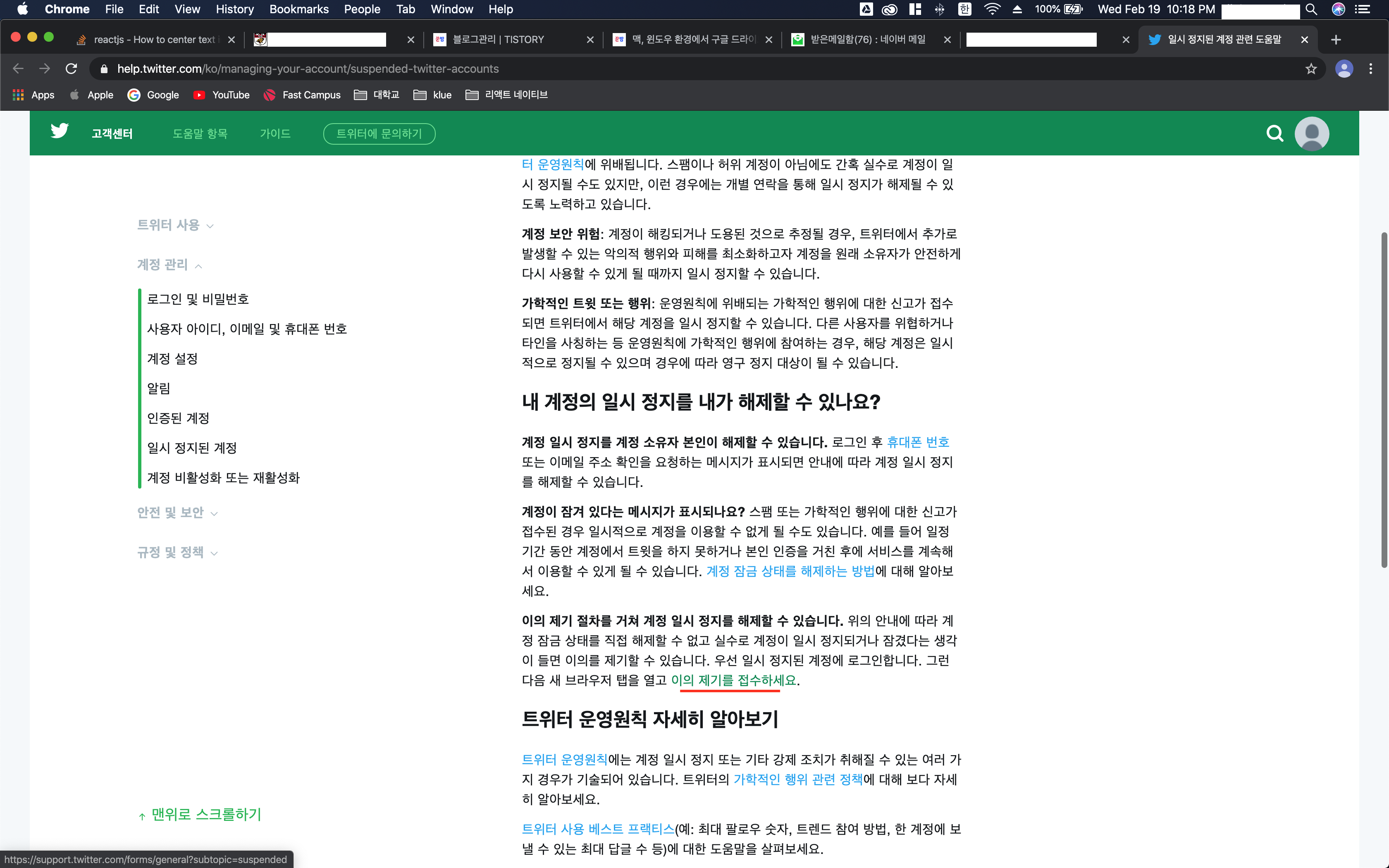 자세히 알아보기를 클릭하면 계정의 일시정지를 해제할 수 있습니다. 핸드폰이나 메일 주소를 확인하면 풀 수도 있다는데, 저 같은 경우엔 계정이 잠겨있다는 메세지가 표시되기 때문에 이의 제기 접수 링크를 클릭하여 이의를 제기해야 했습니다. 보통 다 이의 제기를 해야 풀어줄 거에요!