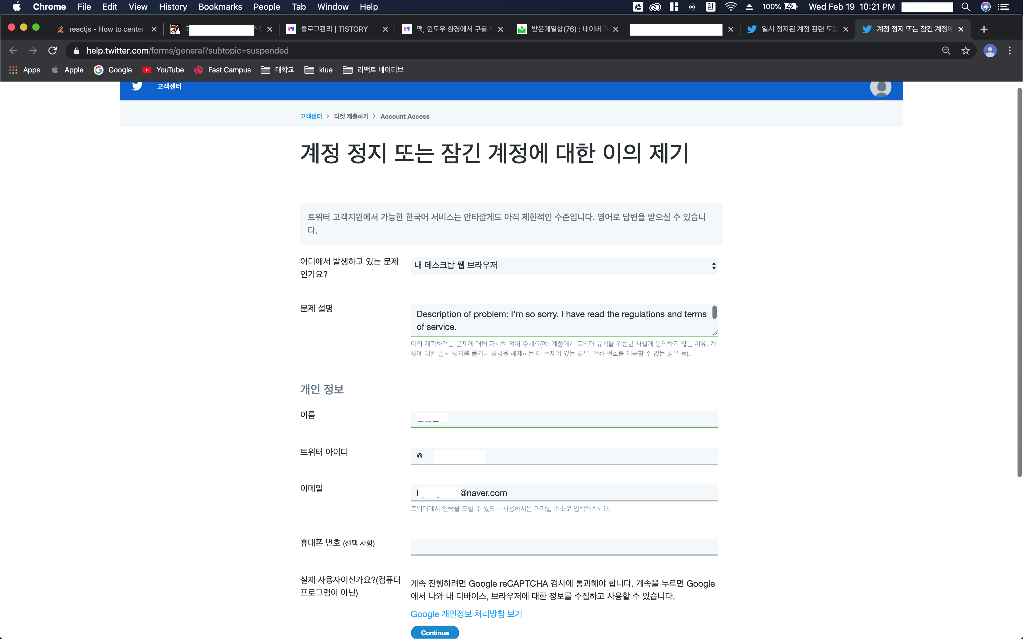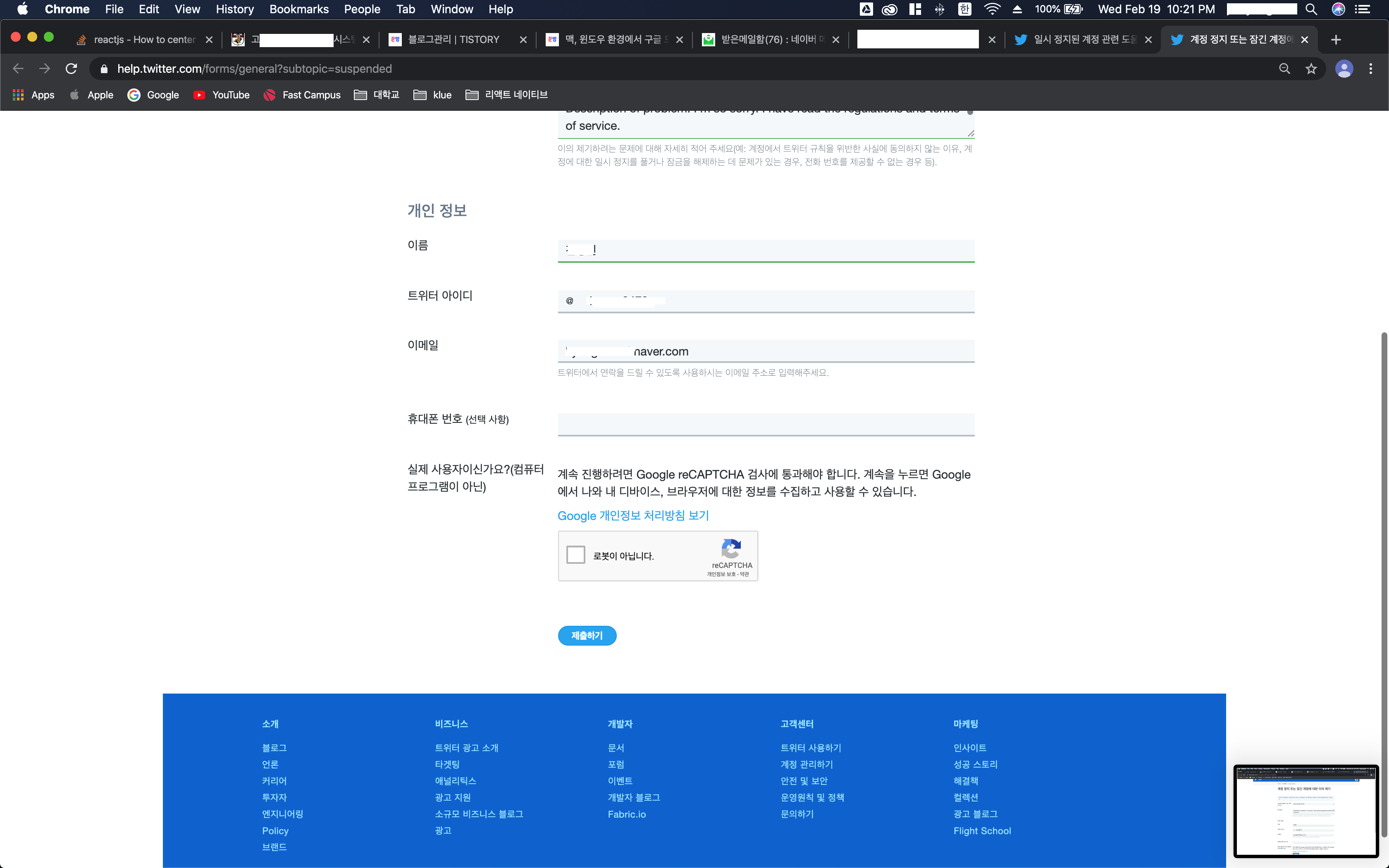 로봇이 아닙니다를 확인해주어야합니다. 트위터 개발자 분들이 철저하게 인증처리를 해놓았더라구요. 제출하면 이의가 제출됩니다. 휴대폰 번호는 선택사항이니 입력 안하셔도 됩니다. 답변이 메일로 올테니 기다려봅시다.