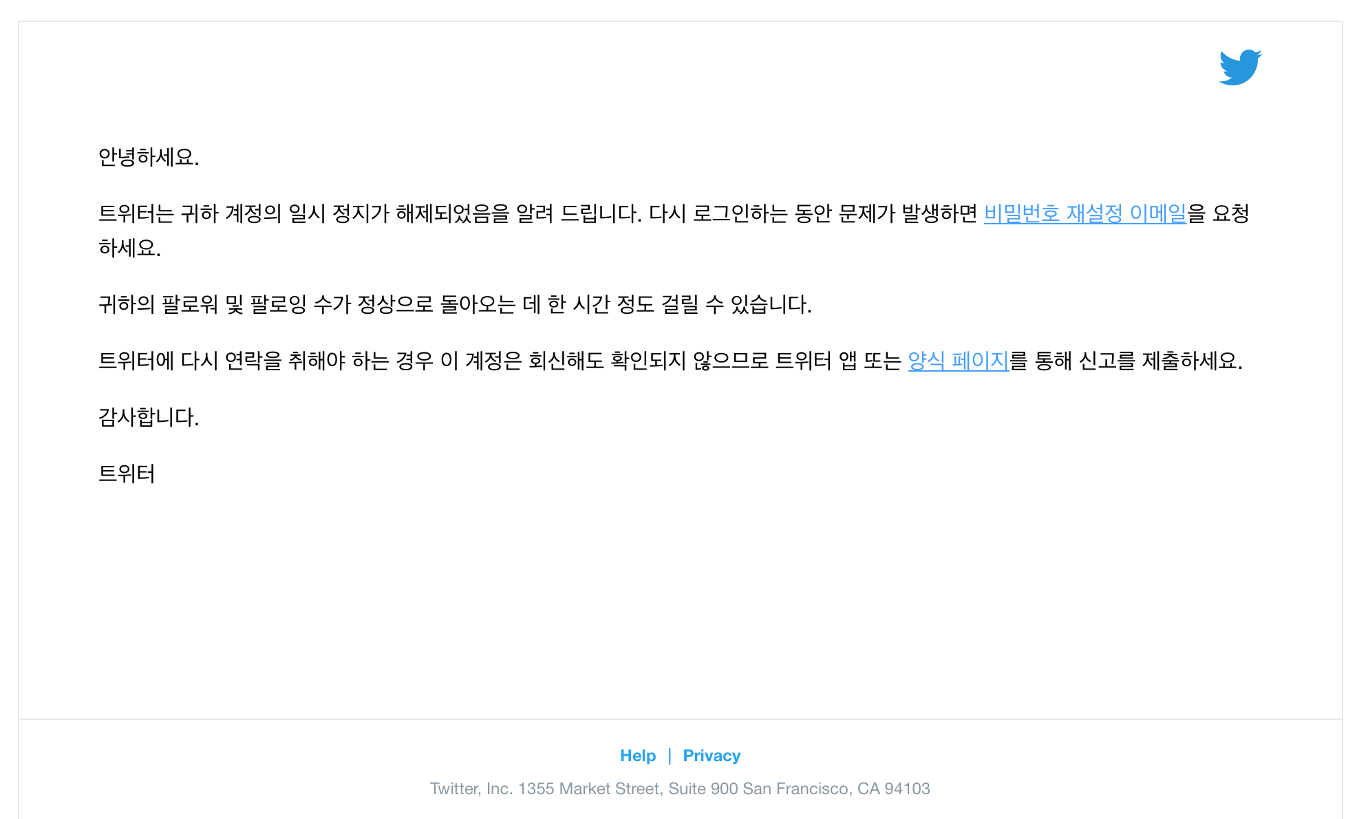 트위터는 전 세계적으로 가장 많이 사용되고 있는 블로그 서비스이자 소셜 네트워크 서비스입니다. 때문에 소셜 네트워크나 덕질에도 많이 사용되지만, 블로그를 하는 사람들도 공유하는 매체로 많이 사용하고 있는데요. 계정이 해킹당하거나 잘못된 행동으로 인해 트위터의 계정이 잠금되거나 일시 정지 되는 분들이 있을 겁니다.