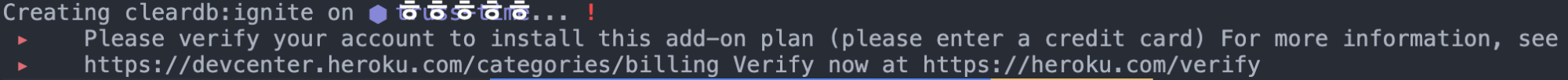 heroku 에서는 ClearDB MySQL을 사용할 수 있게 해주는데요. 이 DB 를 사용하려면 위와 같은 명령어를 통해 설치할 수 있습니다. ignite 옵션이 무료버전이에요. 설치가 다 되면 두 번째 줄처럼 로그가 남을겁니다.