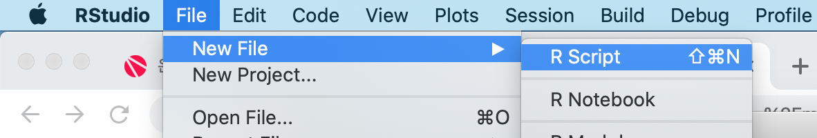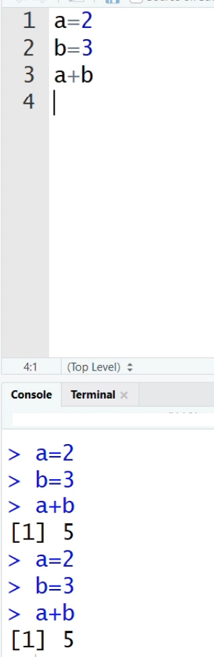 콘솔에 이렇게 입력해봅시다. 변수 두개를 선언해서 둘을 더한 값인 5를 1번 라인에 잘 출력해주고 있죠? 하지만 매번 긴 코드를 이렇게 콘솔에 작성할 순 없으니 R Script를 사용해야 합니다. 메뉴 바에서 파일 > 새 파일 > R 스크립트를 누르시면 됩니다. 단축키는 컨트롤 쉬프트 N 이에요!