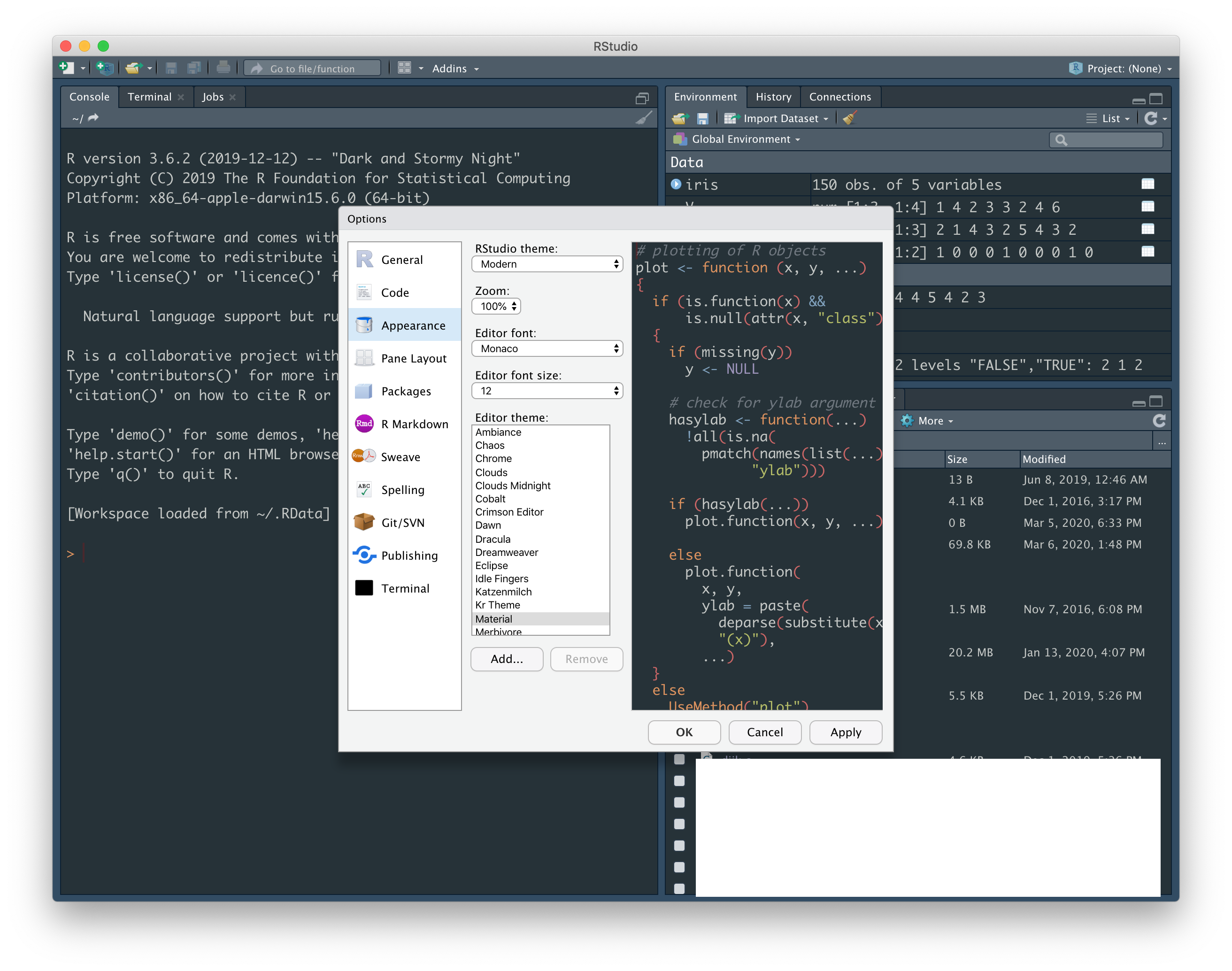 다운로드 후 R Studio를 실행합니다. 실행하면 위와 같은 창이 나올텐데요. 콘솔과 파일 디렉토리, 환경 변수들을 볼 수 있습니다. 콘솔창이 조금 보기 불편하거나 글씨 크기가 작다. 혹은 하얀색 배경이 눈이 피로하다 하는 사람들은 다른 에디터처럼 테마를 조절할 수 있습니다. 여기서 위 메뉴바에 Tools > Global Options... 를 들어가 세 번째 메뉴 Appearance 창에서 조절하시면 되는데요.