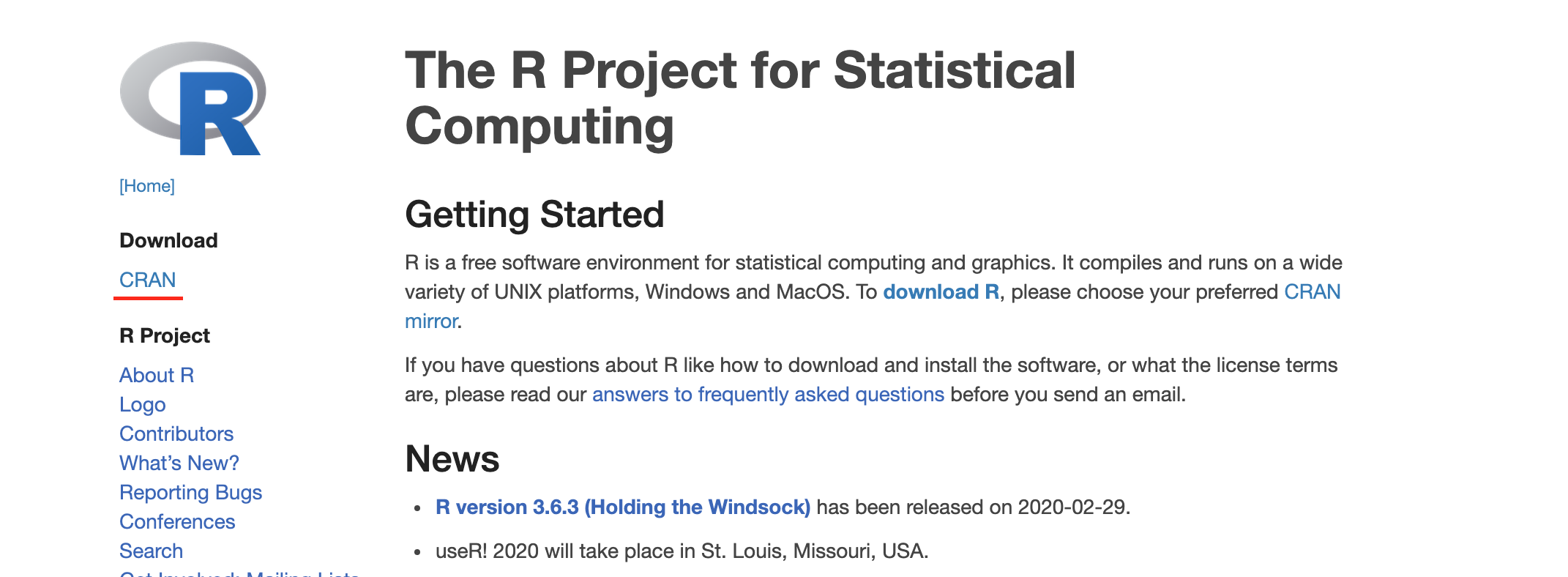 먼저 R 프로그램을 다운받아 설치해야합니다. 링크를 눌러 들어가서 Download 밑의 CRAN을 눌러 적절한 클라우드를 선택합니다.
