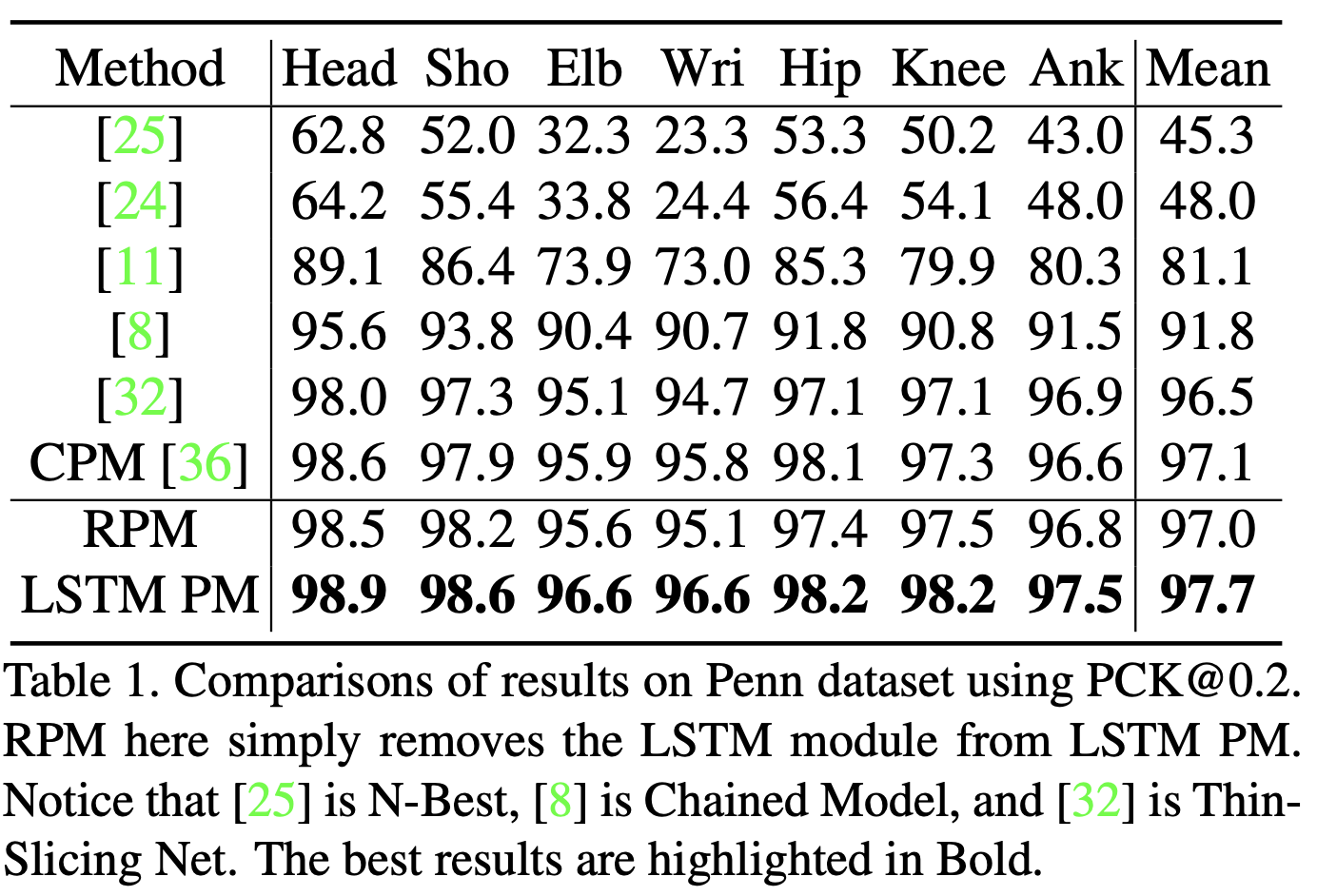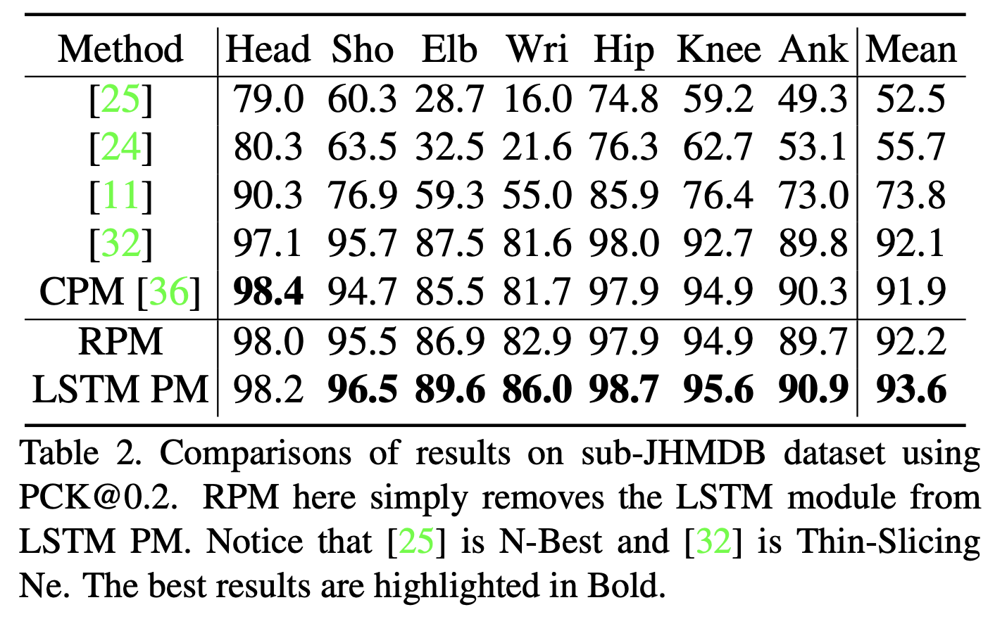Results on Penn and sub-JHMDB. 표 1과 표 2는 펜 데이터 세트와 하위 JHMDB 데이터 세트에 대한 모델 및 이전 작업의 성능을 보여줍니다. Eq. (3)에 명시된 LSTM 포즈 머신(LSTM PM)과는 별도로, Eq. (2)에 설명된 대로 단순화된 반복 포즈 머신 모델(RPM)도 제시합니다. 간단히 LSTM 모듈을 제거하고 LSTM 구성 요소의 기여도를 연구하기 위해 동일한 파라미터를 사용하여 교육했습니다. 모델에서 장기적인 시간적 정보를 고려함으로써 두 벤치마크에서 모두 개선된 결과를 얻었습니다. Seagate의 최첨단 LSTM 포즈 머신을 Thin-Slicing Net[32]과 같은 이전의 비디오 기반 포즈 추정 방법과 비교하면, 펜 벤치마크의 경우 모든 신체 부위에 고르게 분포하는 1.2%의 전반적인 개선을 관찰합니다. 그 모든 부분들 중에서, 1.9% 증가의 가장 큰 부상이 손목에서 온다는 것을 발견했습니다. 마찬가지로 서브JHMDB 데이터 세트의 경우 거의 모든 접합 부분에서 개선을 달성했습니다. 가장 큰 증가는 팔꿈치와 손목에서 나온다는 것을 알아챌 가치가 있습니다. 이것은 급격한 움직임과 폐색에 노출되는 관절의 예측 정확도를 강하게 향상시켰기 때문에 중요한 결과입니다. 실험에서, 동일한 훈련 계획으로 이 두 데이터 세트에 대한 CPM 모델[36]도 훈련했습니다. Qualitative 결과는 그림 3에 나와 있습니다. 이 논문의 방법이 강력한 예측 능력을 통해 프레임 간의 큰 변화에 대처하는 데 특히 적합하다는 것을 알 수 있습니다. 비록 몸이 움직이고 있거나 비디오 중간에 끼어 고생하고 있지만, 그들의 과거 궤적을 통해 위치를 부드럽게 추론할 수 있습니다.