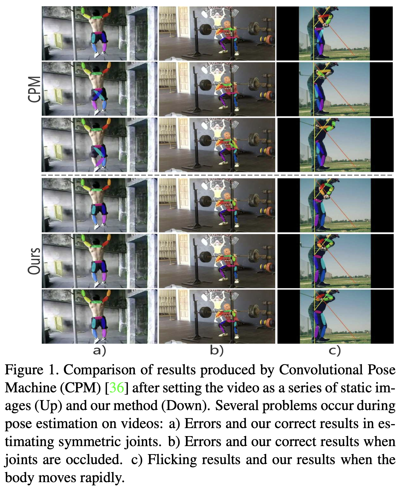 두 번째 샘플의 경우 첫 번째 프레임에서 왼쪽 손목을 볼 수 있지만 다음 두 프레임에 가려집니다. 저희 모델에서, 왼쪽 손목이 첫 번째 프레임에서 인식되었기 때문에, 다음 프레임은 마지막 단계의 메모리 셀로 그것의 위치를 유추할 수 있습니다. 더욱이, 세 번째 샘플에서 팔꿈치의 움직임은 휙휙 소리를 내지만, 모델은 정적 관절(예: 고관절과 예리함)을 유지할 수 있고, 기억 세포와 새로운 입력에 의해 빠르게 움직이는 관절(예: 팔꿈치)의 새로운 정보를 빠르게 추적할 수 있습니다.