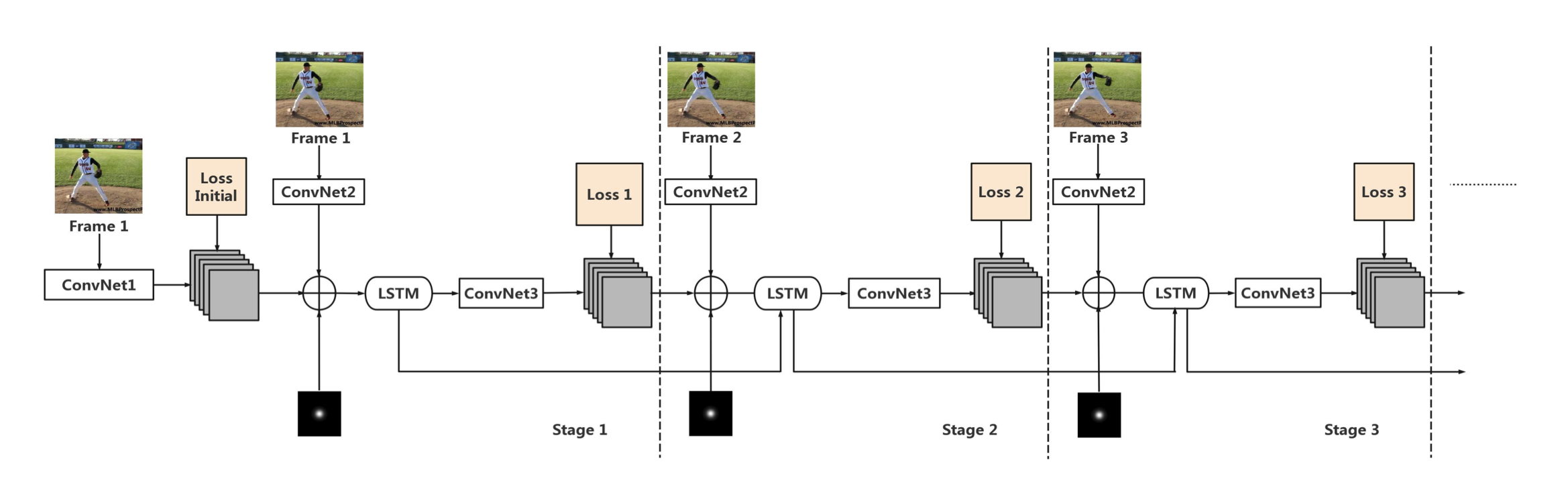 - In each stage, one frame from a sequence will be sent into the network as input.