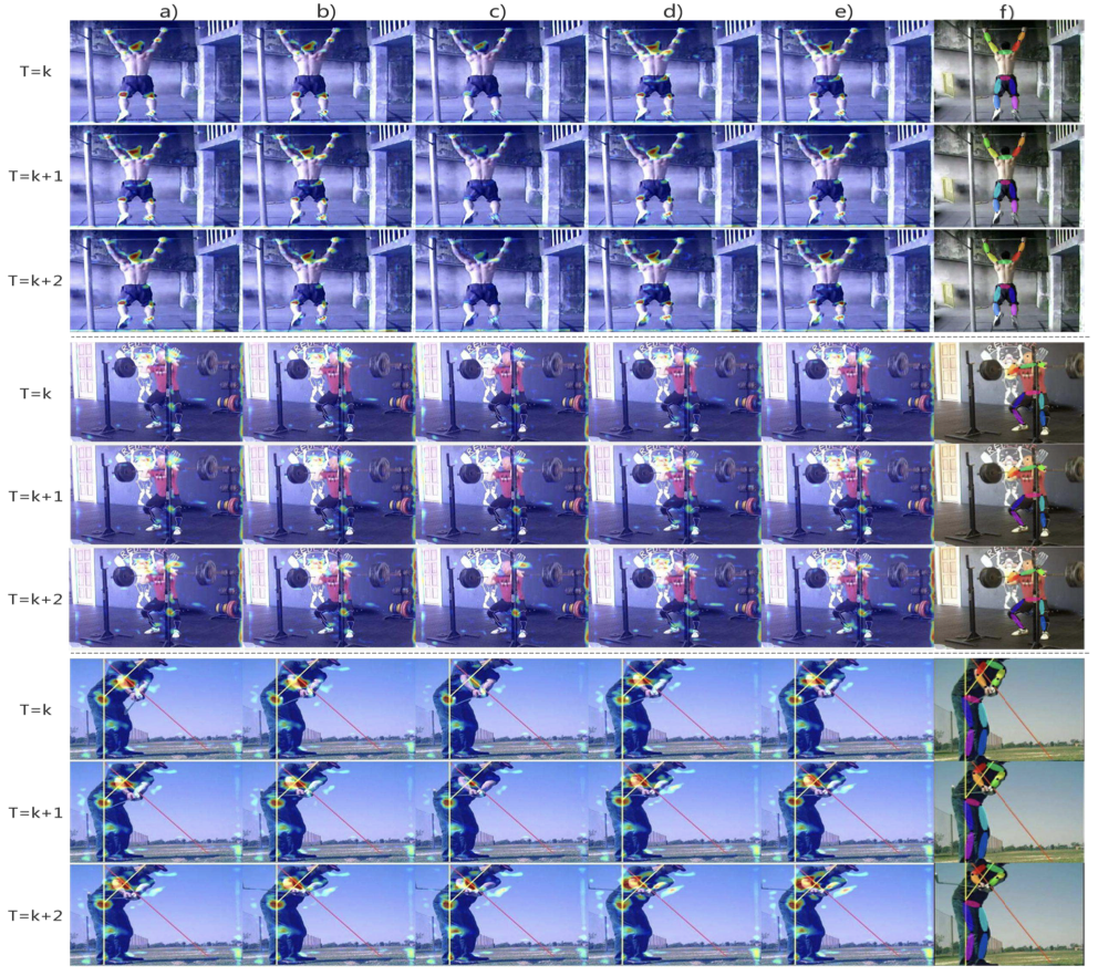 LSTM의 더 중요한 특성은 유용한 사전 정보와 새로운 지식을 모두 사용하여 메모리를 유지한다는 것입니다. Eq. (4)에서 설명한 것처럼 LSTM은 각 반복 동안 잊고 기억하는 과정을 거칩니다. 그림 5의 각 행에는 한 번의 반복 내에서 메모리 셀의 여러 단계가 나와 있습니다. 반복 내에서 LSTM의 진화를 캡처합니다(선택된 채널 하나만 표시됨). 각 열은 그림 설명에 따라 단일 위상을 나타냅니다. 첫 번째 샘플에서 잊기 연산은 세 개의 연속 프레임(col.3)에서 거의 정적인 손목과 머리와 같은 다음 단계의 예측을 위해 유용한 정보를 선택적으로 보존하는 반면, 이 단계의 새로운 입력은 무릎과 같은 관절의 최신 외관을 포함하는 영역을 더 강조한다는 것을 관찰할 수 있습니다. 3개의 프레임에서 연속해서 움직입니다(col. 4). 이 두 부분은 새 메모리로 결합되고 새 메모리는 높은 신뢰도로 새 프레임에 대한 예측을 생성합니다(col. 5). 그렇기 때문에 모델은 시간적 지오메트릭 일관성을 포착하고 그림 1에서 설명한 것처럼 비디오의 실수를 방지할 수 있습니다.