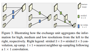 Repeated multi-scale fusion. 각 하위 네트워크가 다른 병렬 하위 네트워크에서 반복적으로 정보를 수신하도록 병렬 하위 네트워크에 걸쳐 교환 단위를 도입합니다. 다음은 정보 교환 방식을 보여주는 예입니다. 세 번째 단계를 여러 개의 교환 블록(예: 3)으로 나누었고, 각 블록은 병렬 유닛을 가로지르는 교환 유닛을 가진 3개의 병렬 컨볼루션 유닛으로 구성되어 있으며, 다음과 같이 제공됩니다.