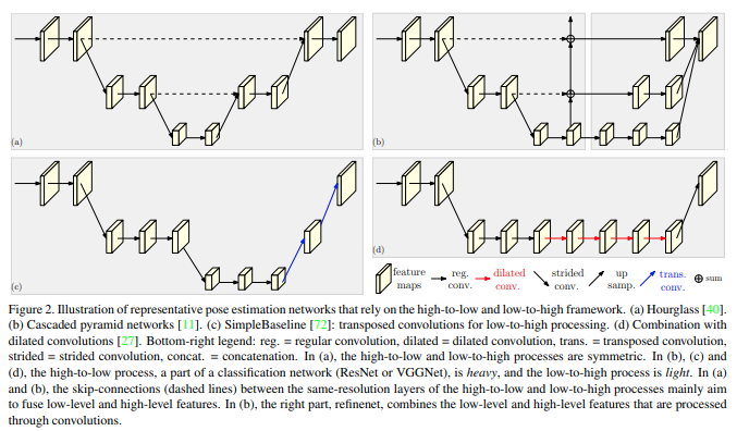 대표적인 네트워크 설계 패턴으로는 (i) 대칭 하이 투 로우 및 로우 투 하이 프로세스가 있습니다. 모래시계와 그 후속 조치[40, 14, 77, 31]는 낮은 공정에서 높은 공정까지의 거울로 디자인합니다. (ii) 높은 공정에서 낮은 공정과 낮은 공정의 밝은 낮은 공정에서 높은 공정의 거울로 디자인합니다. 하이-투-로우 프로세스는 ImageNet 분류 네트워크(예: [11, 72]에서 채택된 ResNet)를 기반으로 하며 로우-투-하이 프로세스는 단지 몇 개의 이진 업샘플링 [11] 또는 트랜스포스 컨볼루션 [72] 레이어입니다. (iii) 확장된 컨볼루션과의 조합입니다. [27, 51, 35]에서는 공간 해상도 손실을 제거하기 위해 ResNet 또는 VGGNet의 마지막 두 단계에서 확장 컨볼루션을 채택하고, 이후 가벼운 저-고 프로세스로 resolution을 더욱 증가시켜 확장 컨볼루션을 사용하기 위한 값비싼 계산 비용을 피합니다 [11, 27, 51]. 그림 2는 4개의 대표적인 포즈 추정 네트워크를 보여줍니다.