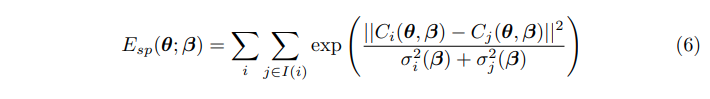 우리는 3.1절에 소개된 캡슐 근사를 이용하는 interpenetration error term를 정의합니다. 우리는 오류 용어를 “incompatible” capsules 사이의 교차 볼륨(즉, 자연스러운 포즈에서 교차하지 않는 캡슐)과 연관시킵니다. 캡슐 교차점의 부피는 계산이 간단하지 않기 때문에 캡슐 축을 따라 중심 C(θ, β)가 있고 캡슐 반경에 해당하는 반지름 r(β)가 있는 구(球)로 캡슐을 단순화합니다. 우리의 페널티 용어는 [47]의 3D 가우스 모델을 혼합한 것에서 영감을 받았습니다. 우리는 각 구에 대해 σ(β) = r(β)/3을 갖는 3D 등방성 가우시안(β)을 고려하고, 패널티를 "불가능한" 부분에 해당하는 가우시안 곱의 적분의 스케일 버전으로 정의합니다.