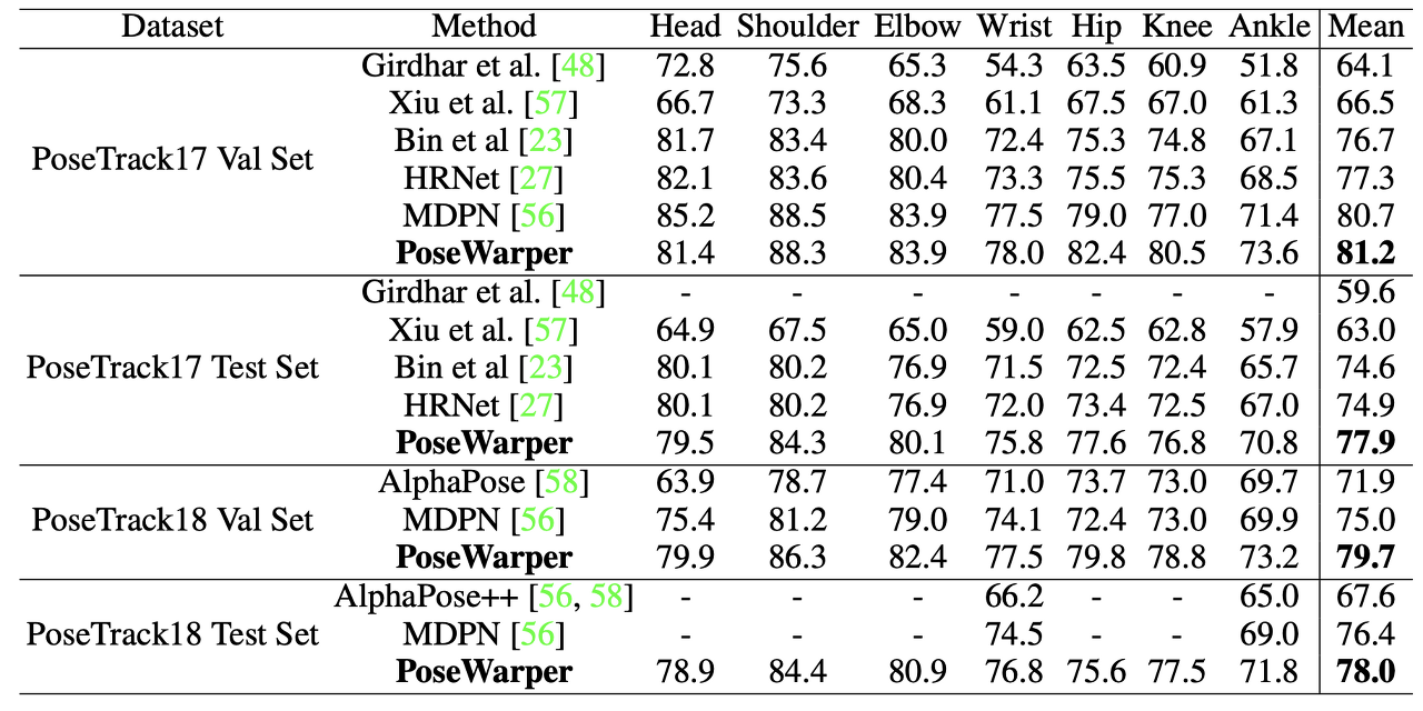 - 표 1. PoseTrack 2017 [22] 유효성 검사 세트(mAP로 측정)에서 비디오 포즈 전파의 결과입니다. 당사는 몇 프레임으로 제공되는 수동 주석에서 전체 비디오에 걸쳐 포즈 정보를 전파합니다. PoseWarper 아키텍처에서 서로 다른 수준의 확장 컨볼루션 효과를 연구하기 위해 몇 가지 절제 기준도 포함합니다(표 하단 참조).