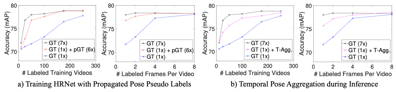 - 그림 4. 전파된 포즈 pseudo 라벨(왼쪽)을 사용하여 표준 HRNet을 교육하는 그림[27] 및 추론 중 시간 포즈 집계 체계입니다. 두 설정 모두에서 1) 희박하게 레이블이 지정된 교육 비디오 수(비디오당 수동으로 레이블이 지정된 프레임 수)와 2) 비디오당 레이블이 지정된 프레임 수(총 50개의 희박하게 레이블이 지정된 비디오 수)의 함수로 포즈 감지 성능을 연구합니다. 모든 기준선은 서로 다른 교육 세트에서 표준 HRNet [27] 모델을 재교육하는 것을 기반으로 합니다. "GT(1x)" 기준선은 희박하게 라벨이 지정된 비디오 데이터에 대해 표준 방식으로 교육됩니다. "GT(7x)" baseline은 "GT(1x)" baseline에 비해 manual annotation이 7배 더 많은 데이터를 사용합니다. 왼쪽 하위 그림("GT(1x) + pGT(6x))의 접근 방식에서는 전파된 포즈 유사 레이블(수동으로 레이블이 지정된 프레임마다 6개 근처 프레임)로 원본 sparsely labeled 비디오 데이터를 augment 합니다. 마지막으로, b) "GT (1x) + T-Agg"는 추론 중에 여러 인접 프레임의 포즈 정보를 결합하기 위해 PoseWarper를 사용하는 것을 나타냅니다("GT (1x)" 기준선에서와 같이 훈련이 수행됩니다. 결과를 통해 PoseWarper의 두 애플리케이션 모두 수동 주석 수를 줄이면서 강력한 포즈 정확도를 달성할 수 있는 효과적인 방법을 제공한다는 것을 알 수 있습니다.