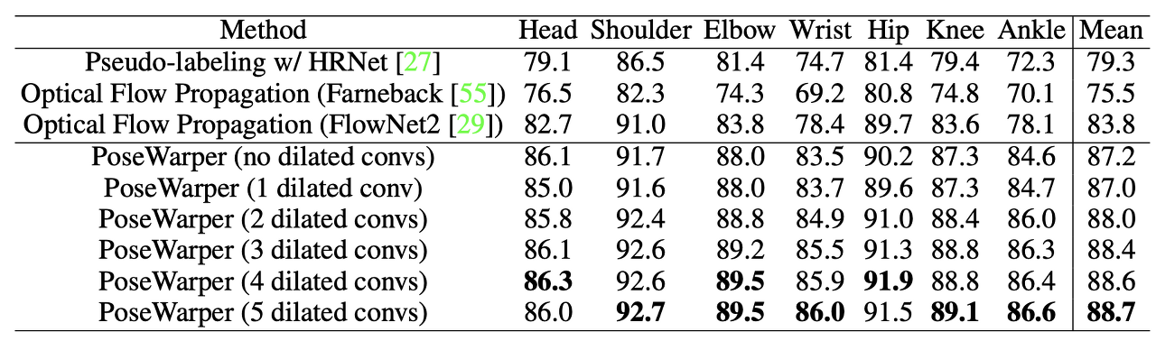 Ablation Studies on Dilated Convolution. 표 1에서는 PoseWarper 아키텍처에서 서로 다른 수준의 확장 컨볼루션 효과를 조사한 결과도 제시합니다. 비디오 포즈 전파 작업에서 이 모든 변형을 평가합니다. 첫째, 원래 아키텍처에서 dilated 컨볼루션 블록을 제거하면 정확도가 88.7mAP에서 87.2mAP로 감소한다고 보고합니다. 또한 단일 확장 컨볼루션(확장 속도 3 사용)을 사용하는 네트워크는 87.0mAP를 산출합니다. 두 번째 확장 컨볼루션 수준(확장율 3, 6 사용)을 추가하면 정확도가 88.0으로 향상됩니다. 세 가지 확장 수준(확장 속도 3, 6, 12)은 mAP 88.4이고 네 가지 수준(확장 속도 3, 6, 12, 18)은 mAP 88.6입니다. 5개의 확장 컨볼루션 레벨이 있는 네트워크는 88.7mAP를 산출합니다. 더 많은 확장 컨볼루션을 추가한다고 해서 성능이 더 향상되는 것은 아닙니다. 또한 1, 2, 3, 4, 5, 8, 16, 24, 32의 dilated rate를 사용하는 두 개의 네트워크를 실험하여 이러한 모델이 각각 88.6과 88.5의 mAP를 산출한다고 보고했습니다.