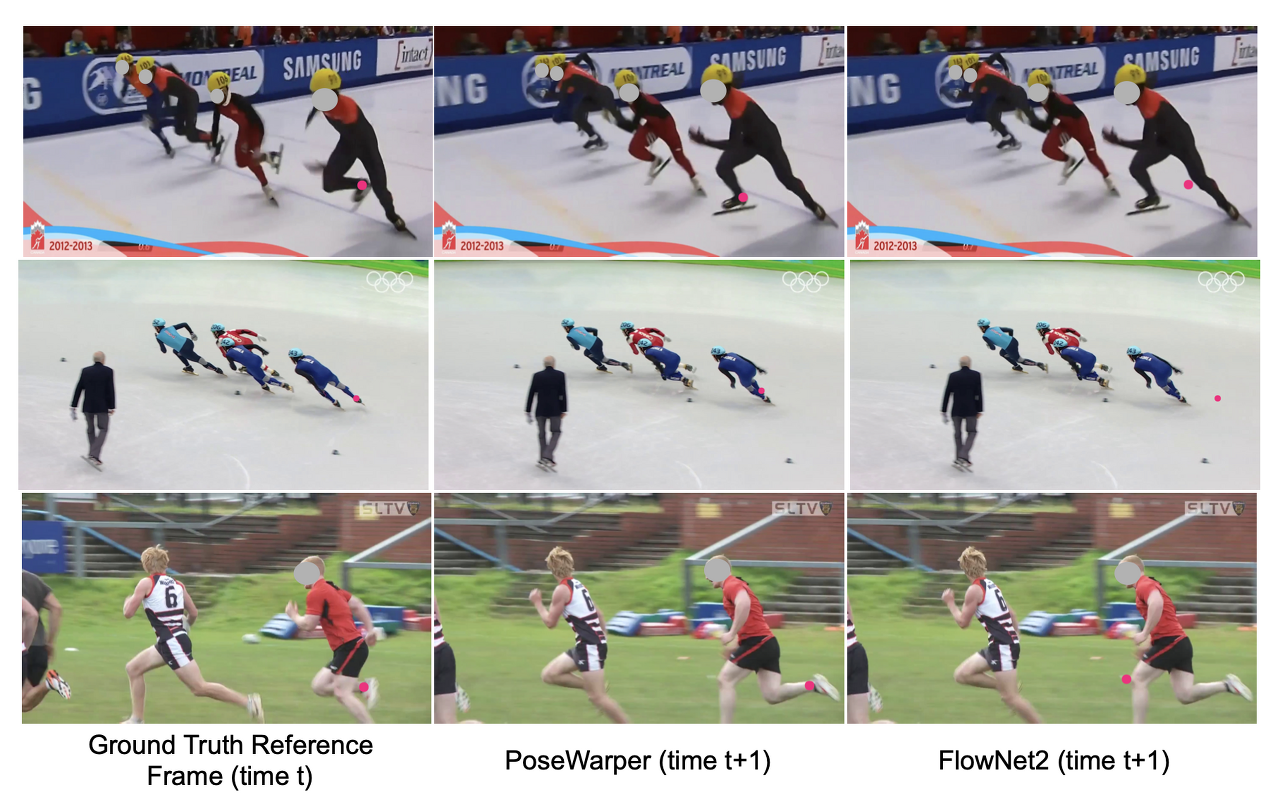 Qualitative Comparison to FlowNet2. 그림 3에서는 PoseWarper에 의해 인코딩된 모션의 그림을 포함하며 비디오 포즈 전파 작업을 위해 FlowNet2에서 계산한 optical flow와 비교합니다. 각 3-프레임 시퀀스의 첫 번째 프레임은 시간 t에서 라벨이 지정된 기준 프레임을 나타냅니다. 보다 깔끔한 시각화를 위해 프레임마다 분홍색 동그라미가 표시된 '오른쪽 발목' 신체 관절만 1인용으로 보여 줍니다. 두 번째 프레임은 시간 t에 라벨이 부착된 프레임에서 시간 t+1에 라벨이 부착되지 않은 프레임으로 전파된 "오른쪽 발목" 탐지를 나타냅니다. 세 번째 프레임은 FlowNet2 기준선에 의해 생성된 프레임 t+1의 전파된 탐지를 보여줍니다. 이러한 결과는 1) 큰 모션, 2) 막힘 또는 3) 흐릿한 경우 FlowNet2가 자세를 정확하게 왜곡하는 데 어려움을 겪는다는 것을 나타냅니다. 이와 대조적으로, 당사의 PoseWarper는 이러한 사례를 강력하게 처리하며, 이는 표 1의 결과(즉, 83.8 mAP w.r.t 대비 88.7)로도 알 수 있습니다. FlowNet2).