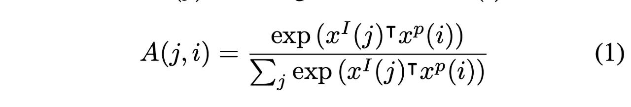 여기서 similarity A(j, i)는 각 xp(i)에 대해 xI의 공간 치수에 대한 softmax에 의해 정규화됩니다. affinity function는 모든 feature dimension에 대해 정의됩니다.