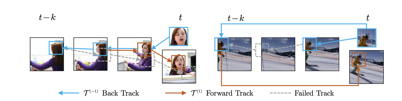 Tracker는 그림 4a에 표시된 것처럼 features을 뒤로 따라가 i steps를 forward하여 초기 쿼리로 재도착합니다.