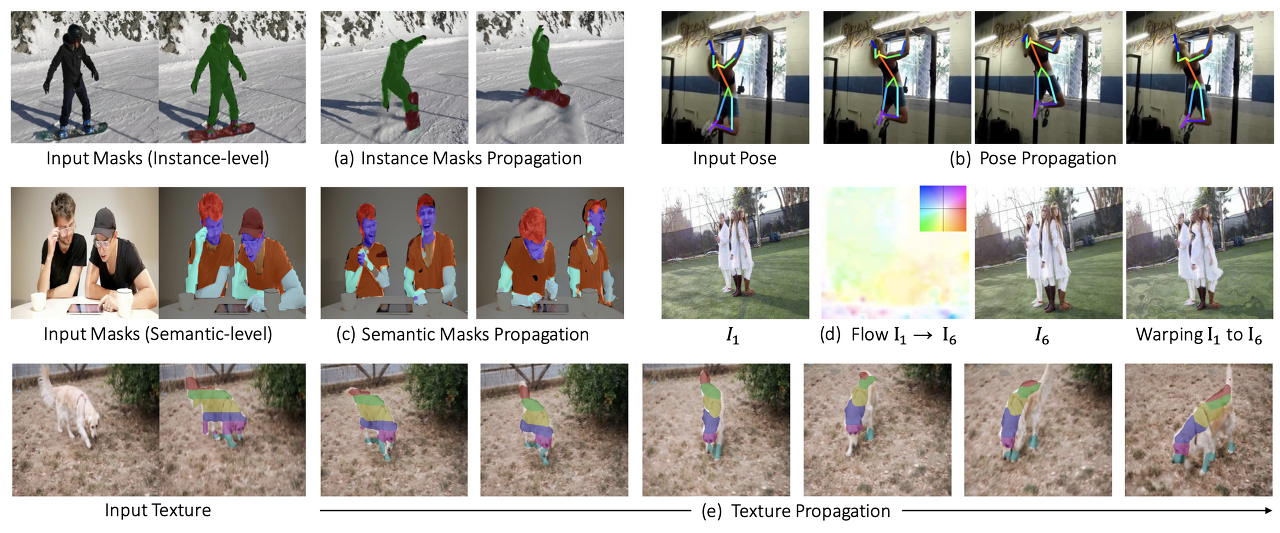 - 그림 1: raw 비디오에서 시각적 대응에 대한 representation을 배울 것을 제안합니다. 획득한 representation은 미세 조정 없이 시각적 대응과 관련된 다양한 작업으로 일반화되어 (a) 다중 인스턴스 마스크, (b) 포즈, (c) 시맨틱 마스크, (d) 장거리 optical flow, (e) 텍스처를 propagate.