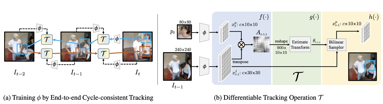 - Figure 4: Method Overview. (a) training, the model learns a feature space encoded by φ to perform tracking using tracker T . By tracking backward and then forward, we can use cycle-consistency to supervise learning of φ. only the initial patch pt is explicitly encoded by φ; other patch features along the cycle are obtained by localizing image features. (b) We show one step of tracking back in time from t to t − 1.