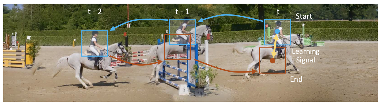 - 그림 2: A Cycle in Time. 비디오가 주어진 경우, 시간 내 사이클에 의해 형성된 시퀀스를 따라 추적하는 것은 self supervised될 수 있습니다. target은 사이클의 시작일 뿐입니다. 시작과 끝 사이의 노란색 화살표는 미분 가능한 학습 signal.