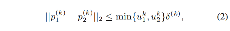 where $u^k_1$ and $u^k_2$ are the Gaussian response size of two joints on heatmaps, determined by the Gaussian response deviation. $δ^{(k)}$ is the parameter for controlling deviation of the $k^{th}$ joint, which we directly adopt from MSCOCO keypoint dataset [15]. The reason why we use $min\{u_1, u_2\}$ rather than a constant threshold is to guarantee that, only if $p_1$ and $p_2$ fall into each others’ control domain (radii are $u^k_1δ^k, u^k_2δ^k$) simultaneously, we group them together. One node represents a group of joints that cluster together by the above criterion. Now, by building a joint group as one node, we have joint node set J = {$v^k_j:$ for $k ∈ \{1, . . . , K\}, j ∈ \{1, . . . , N_k\}\}$, where $N_k$ is the number of joint nodes of body part k, $v^k_j$ is the $j^{th}$ node of body part k. The total number of joint nodes in J is $\Sigma_kN_k$.
