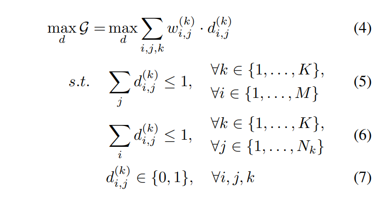 where $d^{(k)}_{i,j}$ indicates whether we keep the edge $e^k_{i,j}$ in our final graph or not. The constraints of Eq. 5 and 6 enforce that each human proposal can only match at most one $k^{th}$ joint.