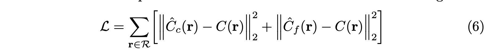 각 장면에 대해 별도의 neural 연속 볼륨 표현 네트워크를 최적화한다. 이는 장면의 캡처된 RGB 이미지 데이터 세트, 해당 카메라 포즈와 고유 매개 변수, 장면 경계만 필요하다. 각 최적화 반복 시, 데이터셋의 모든 픽셀 집합에서 카메라 레이 배치를 무작위로 샘플링한 다음 5.2에 설명된 계층적 샘플링을 따라 coarse 네트워크에서 Nc 샘플, fine 네트워크에서 Nc + Nf 샘플을 쿼리한다. 그런 다음 4.에서 설명한 볼륨 렌더링 절차를 사용하여 두 샘플 집합의 각 ray 색상을 렌더링한다. loss는 단순하게 coarse 렌더링과 fine 렌더링 모두에 대해 렌더링된 픽셀 색상과 실제 픽셀 색 사이의 총 제곱 오차.
