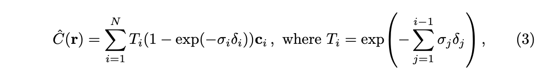 여기서 샘플링한 점들 사이 거리는 $$δ_i = t_{i+1} − t_i$$는 인접 표본 사이의 거리. $$(c_i,σ_i)$$ 값의 집합으로부터 $$\hat{C}(r)$$을 계산하기 위한 함수는 미분 가능하며 알파 값 αi = 1 − exp(−σiδi)인 전통적인 알파 합성으로 감소한다.