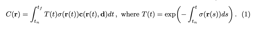 5D neural radiance field은 공간의 어떤 지점에서든 부피 밀도, directional emitted radiance로 장면을 나타낸다. 고전적인 볼륨 렌더링의 원리를 사용하여 장면을 통과하는 모든 광선의 컬러를 렌더링한다. 부피밀도 σ(x)는 x 위치의 극소입자infinitesimal particle에서 끝나는 광선의 미분 확률로 해석할 수 있다. tn과 tf를 갖는 카메라 광선 r(t) = o + td의 예상 색상 C(r)는 다음과 같다.