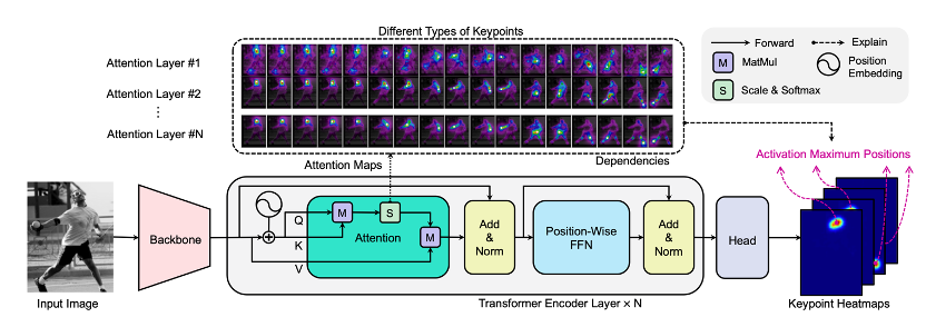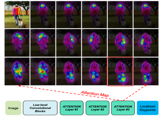 특히 마지막 어텐션 layer에서 모든 이미지 위치에서의 컨트리뷰션을 모아 예측된 키포인트 히트맵에서 max activation을 만드는 역할을 합니다. 이후의 Fead forward network 와 head는 위치별로 컨트리뷰션의 상대적 비율을 변경하지 않고 선형변환을 해주는 것을 의미합니다.