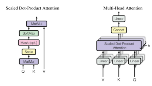 - 이를 위해 Attention 함수의 Query (Q), Key (K), Value (V)를 의미하는 Weight 행렬과 'scaled Dot-Product Attention'방식으로 연산하여 Attention Value Matrix (a)를 만들어낸다. 이 과정에서 d_model개의 차원을 num_heads개 그룹으로 묶어서 d_model/num_head 개의 Attention value matrix를 뽑아낸다.